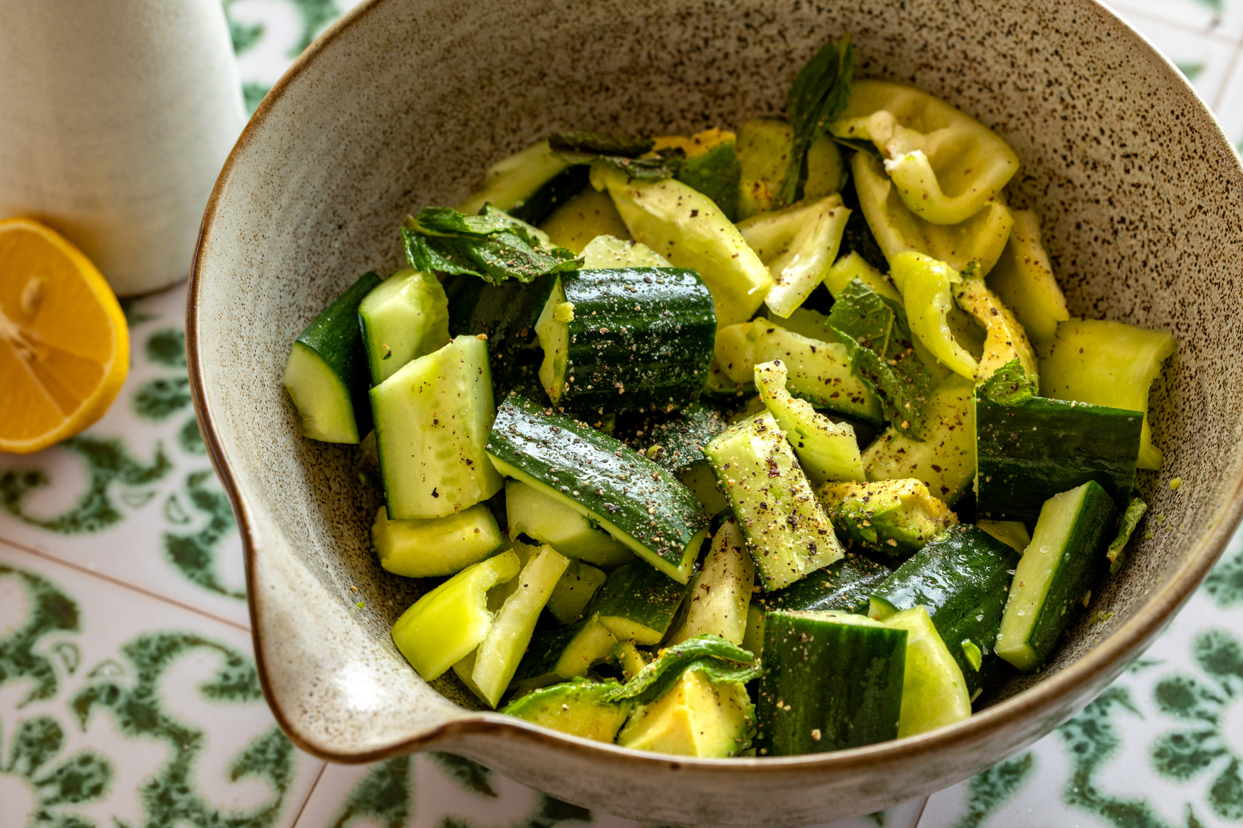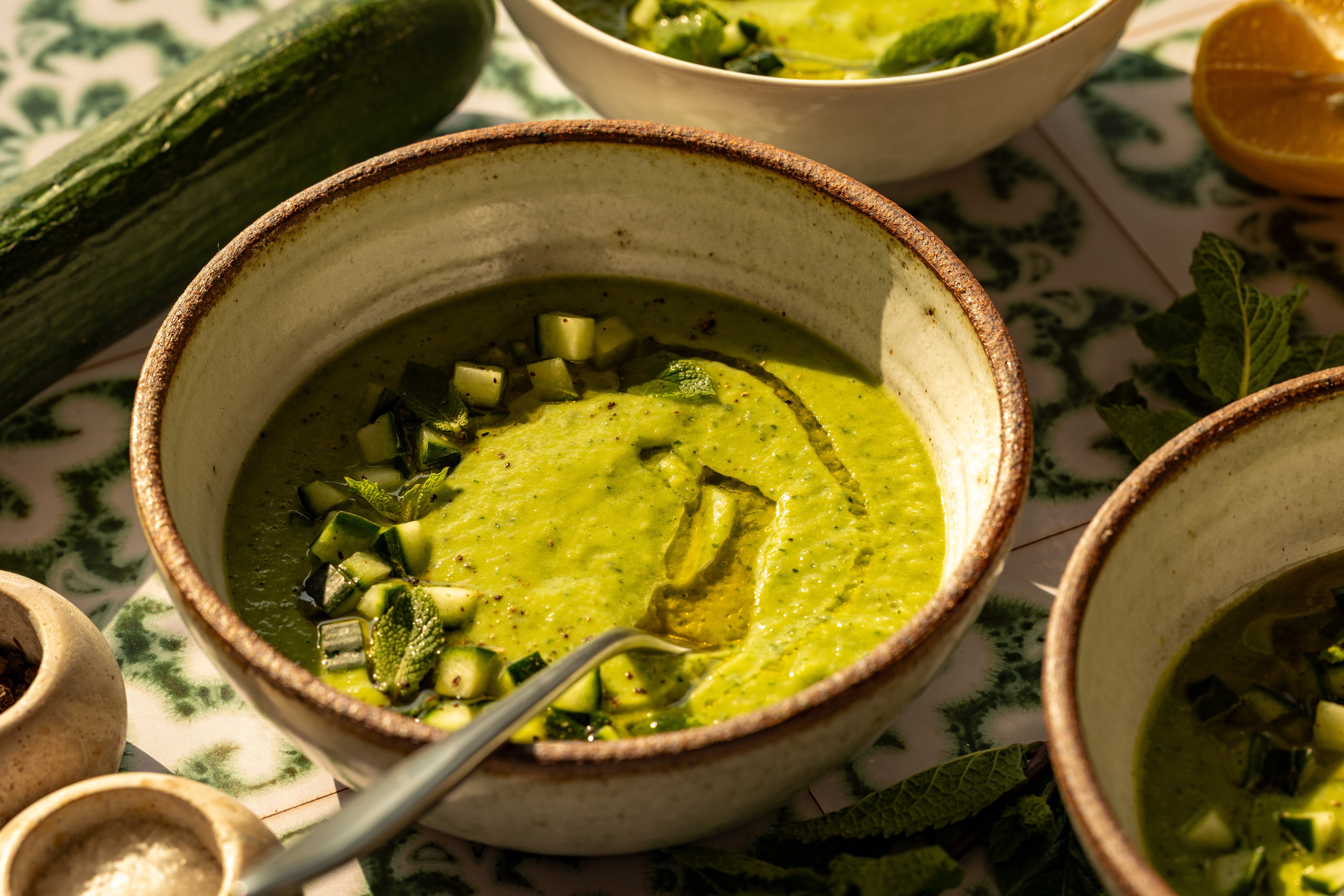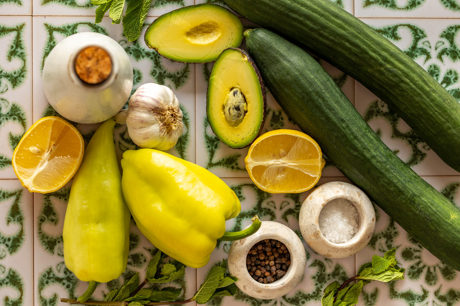 Z uhoriek vyškriabeme semienka a rozkrájame ich na menšie kúsky. K uhorkám pridáme aj nakrájané zelené papriky, avokádo, cesnak, nahrubo nakrájanú mätu, olivový olej, citrónovú šťavu, ocot, soľ a mleté čierne korenie. Všetko spolu rozmixujeme výkonným mixérom a podľa chuti pridáme viac soli či octu. Gazpacho podávame vychladené, dozdobené uhorkou nakrájanou na malé kocky, olivovým olejom a mätou.